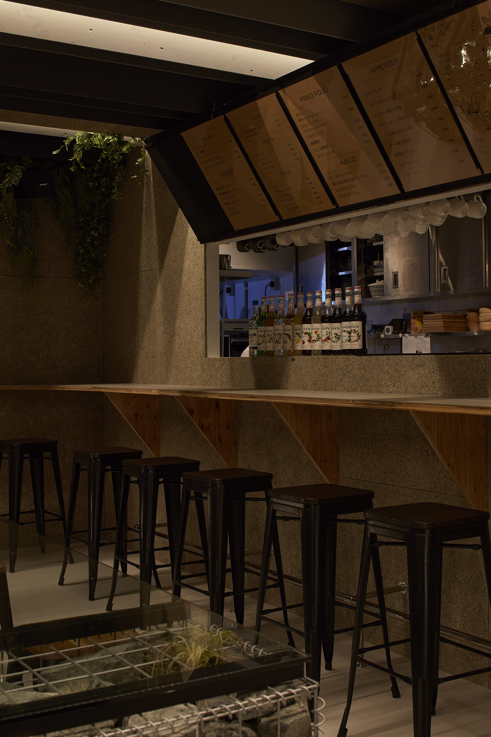 岡山市の中心部に計画したCAFE+BARです。 何か特別なものを提供するのではなく、普段使いのできるくつろげる場所。 日常的に立ち寄りたくなるような、求められたのはそんな場所でした。 一日を通して日の光が変わるようにライティングを計画し 屋外の心地よさを蛇篭を使い室内に取り込みました。 出来上がったお店は、何度でも行きたくなるような くつろげる空間になったのではないかと思います。 沢山の方が日常的に立ち寄ってくれたら良いなと思います。